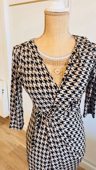Vestido elegante con estampado de pata de gallo. - Diseño cruzado con cinturón. - Manga larga. - Largo hasta la rodilla. Tela muy suave y elastica parece seda.. Usado un par de veces comprado en el puerto banus en una tienda muy cara.. Oportunidad!! Me mudo vendo todo mira mi perfil y llevate mas cosas por un modico precio gracias