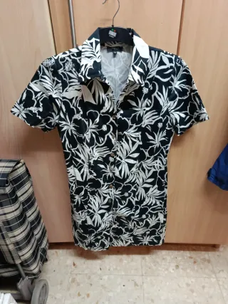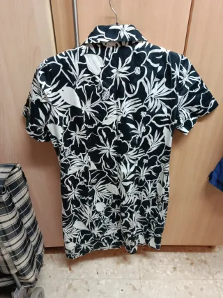 Vestido de manga corta con estampado floral. Pone talla 50 pero no estira y no sirve a una persona que usa XL, por lo que tallara M/L - Diseño llamativo en blanco y negro. - Cuello camisero. - Cierre de botones.