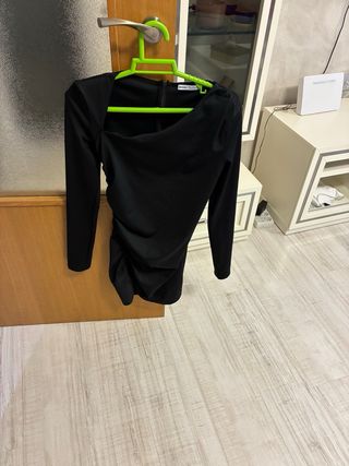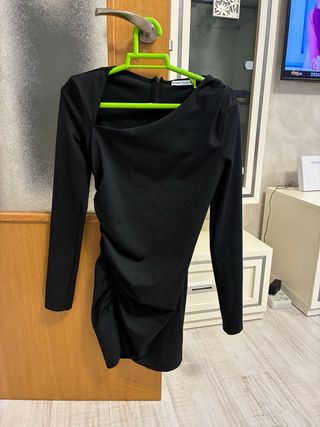 Elegante vestido negro con manga larga y detalle drapeado. Ni lo he usado. - Diseño con cuello alto. - Abertura en la espalda. - Tejido elástico y cómodo.