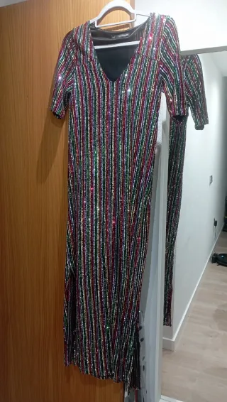Vestido largo de fiesta con un diseño vibrante de rayas verticales cubiertas de lentejuelas brillantes. Ideal para celebraciones y eventos especiales. - Diseño de rayas multicolores. - Acabado brillante con lentejuelas. - Corte largo con abertura lateral.
