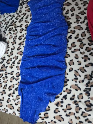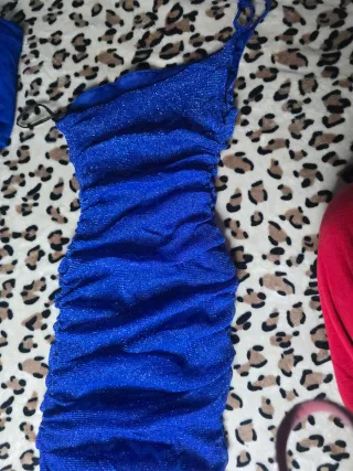 Vestido de fiesta corto con un diseño brillante y llamativo. Perfecto para eventos especiales. - Color azul vibrante. - Tejido con acabado brillante. - Diseño fruncido. - Corte asimétrico. - Tirante fino.