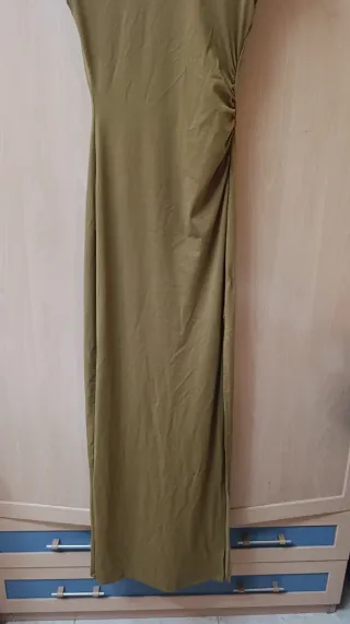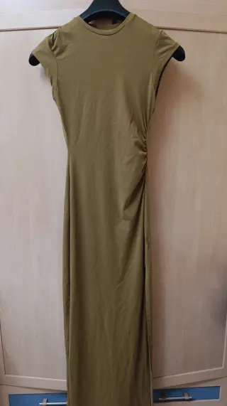 Vestido largo de Bershka en color verde oliva. Presenta un diseño ajustado con detalles fruncidos en un lateral. - Manga corta. - Cuello redondo. - Bajo con abertura lateral.
