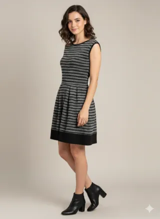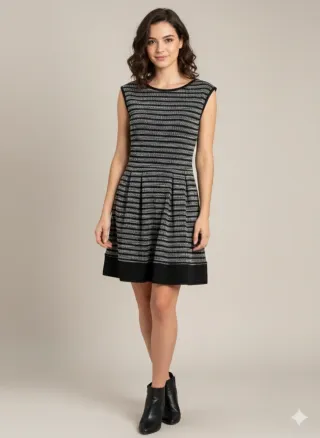 Vestido de corte skater con estampado de rayas horizontales. El diseño presenta un cuerpo ajustado y una falda con vuelo. - Escote redondo. - Manga corta. - Bajo con banda negra. - Tejido de punto.
