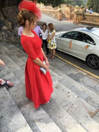 Vestido de encaje con un bonito diseño floral. - Color rojo vibrante. - Manga corta. - Largo hasta la rodilla.