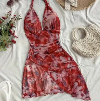 Vestido corto con un llamativo estampado abstracto en tonos rosas y naranjas. - Diseño tipo halter con tiras. - Tejido elástico y cómodo. - Largo hasta la rodilla.