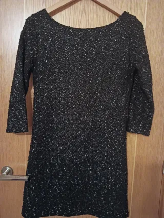 Elegante vestido negro con un diseño brillante de lentejuelas plateadas. Ideal para ocasiones especiales. - Manga larga. - Corte recto. - Tejido con textura.