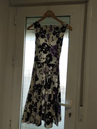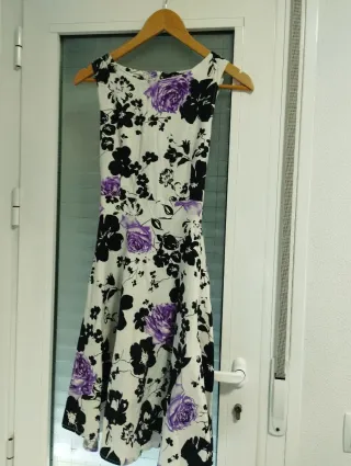 Vestido con estampado floral en blanco y morado. Diseño sin mangas y falda con vuelo. - Estampado de flores en blanco, negro y morado. - Corte acampanado en la falda.