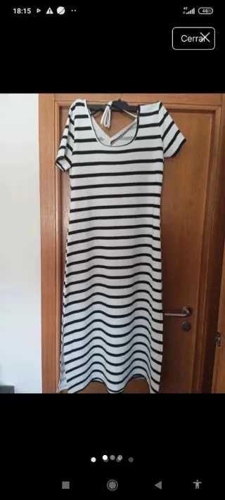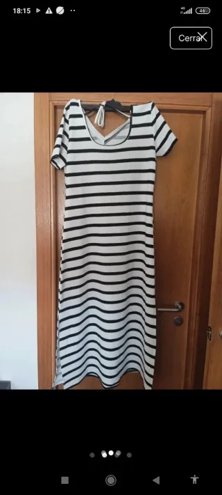 Vestido manga 3/4, largo rodilla, entallado en parte superior y ligero vuelo en la falda.cierre trasero con botón al cuello. Talla M, vale para L. Rayas blanca y negras.