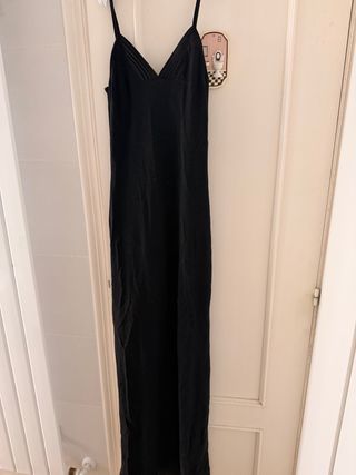 Elegante vestido largo con un diseño de espalda abierta. - Tirantes finos. - Escote en pico con pliegues. - Corte recto y largo hasta los tobillos. La talla equivale a una s aunque ponen G