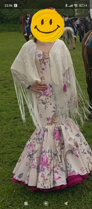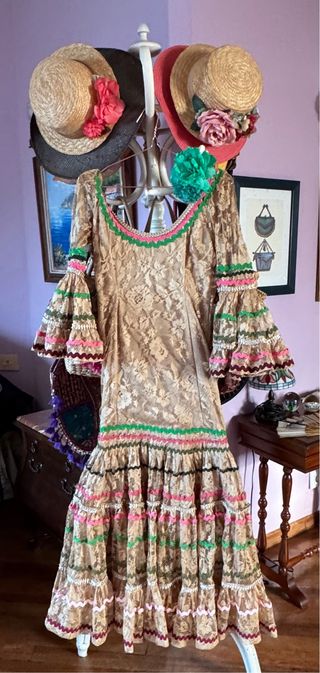 Traje de flamenca o sevillanas con un diseño elegante y festivo. Ideal para ferias y romerías. - Tejido principal en color beige con un delicado encaje floral. - Múltiples volantes en mangas y falda. - Adornos de cintas en varios colores: verde, rosa, negro y burdeos. - Escote adornado con pasamanería.