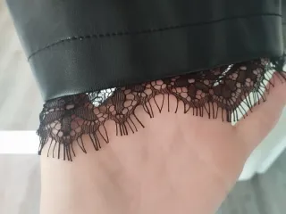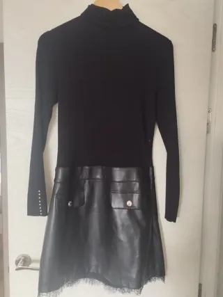 Vestido de Morgan con un diseño elegante y moderno. - Combina tejido de punto en la parte superior con efecto piel en la falda. - Cuello alto. - Manga larga con detalle de botones en el puño. - Falda con dos bolsillos delanteros y detalle de encaje en el bajo.
