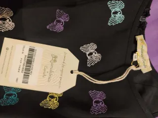 Vestido negro con un diseño original con dibujos de la marca de varios colores en la zona del pecho. Con etiqueta, sin estrenar. Viene bastante largo se puede meter agusto de la altura. Tirantes finos ajustables.