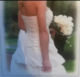 Clásico y favorecedor vestido de novia de Rosa Clara, con un diseño palabra de honor, drapeado en la cintura y detalles de botones en la espalda. - Diseño palabra de honor. - Cierre de botones en la espalda. - Se incluye en el precio can can y velo. - Solo venta en persona