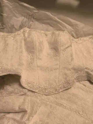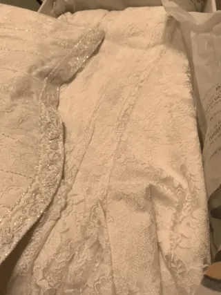 Elegante vestido de novia con un delicado encaje floral y detalles de perlas.Es una talla 40,pero està arreglado para una 34/36 de talla. Dos partes ,es tipo sirena. - Cuerpo tipo corsé con ballenas. - Adorno de pedrería y perlas en el escote. - Tejido con relieve floral. - Diseño de corte sirena.