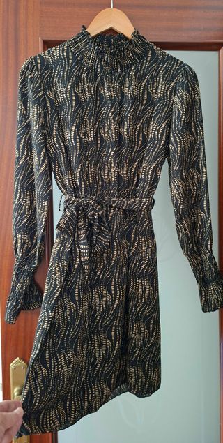 Vestido corto con un bonito estampado en tonos negro y beige. Tiene cuello alto y cinturón. - Manga larga. - Cinturón anudado. - Cuello alto con fruncido. Medidas: Hombros: 39 cm Pecho: 100 cm Largo: 86 cm