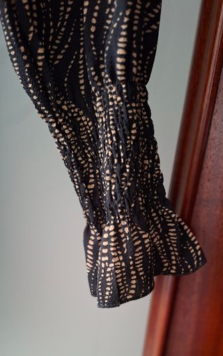 Vestido negro de Zara con detalles en ocre. - Cuello redondo con ribete. - Mangas con puños plisados. - Falda con vuelo.