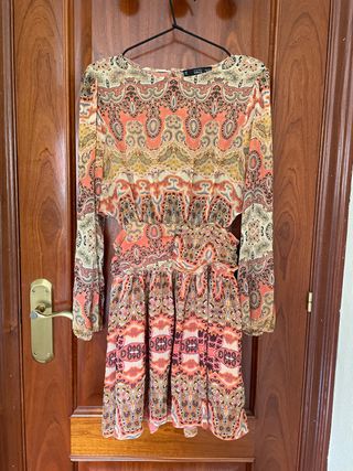 Vestido de Zara con un llamativo estampado. - Diseño de serpiente en tonos naranjas y negros. - Manga larga. Es una XS pero da talla como una Small. - Cuello camisero.