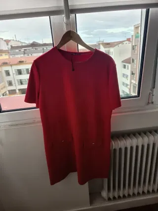 Vestido de mujer de la marca Zara en color rojo. Diseño moderno y versátil. - Dos bolsillos delanteros con detalle. - Manga corta. - Cuello redondo.