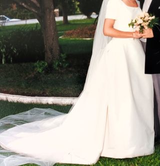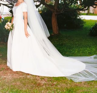 👰 Elegante vestido de novia en tono marfil (o crudo). Diseñado y confeccionado a medida en el Atelier de Covadonga Plaza de Oviedo. Cuenta con varias capas de faldón, lazo azul tradicional, cola con cinta para recoger al bailar. Velo no incluido. 🌟 Tejido: Falla de seda, con un acabado suave, ligeramente brillante y una caída espectacular. 📏 Para referencia: Altura de la novia 1.66 cm, peso entre 50-55 kg (estimo que equivalente a una talla 38-40). 📸 Revisa las fotos para más detalles ya que son parte de la descripción. Son fotos de fotos, espero que puedas verlas bien. Se ve más blanco de lo que es en realidad.