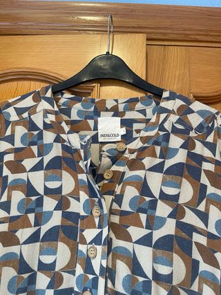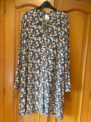 Vestido suelto y cómodo con un estampado geométrico en tonos azules y marrones. - Diseño de manga larga. - Cuello mao con botones. - Corte recto y fluido.