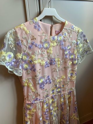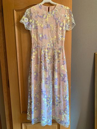 Vestido de fiesta con un delicado estampado floral. - Diseño de manga corta. - Tejido ligero y vaporoso. - Largo midi. -Cremallera Lateral -Precio original 380 euros.
