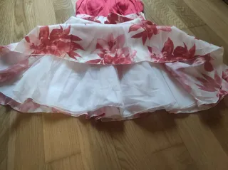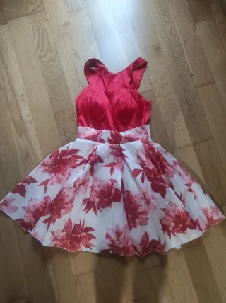 Vestido de fiesta con un diseño vibrante y elegante. - Cuerpo superior en satén rojo. - Falda con estampado floral en tonos rojos y blancos. - Corte acampanado. - Faldón blanco - Queda entallado en la parte de arriba y suelto en la falda. - Corte estructurado. - Cierre con cremallera - sisa 40 cm y largo 90 Cm. Largo de la falda sin la cinturilla 50 cm