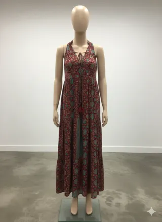 Elegante vestido largo de seda, con un estampado vibrante inspirado en la India. Su diseño fluido lo hace perfecto para cualquier ocasión. - Tejido de seda ligero y transpirable. - Estampado multicolor con base roja. - Diseño de tirantes y escote en V con detalle de cordones y borlas. - Corte holgado5 y falda con varias capas.