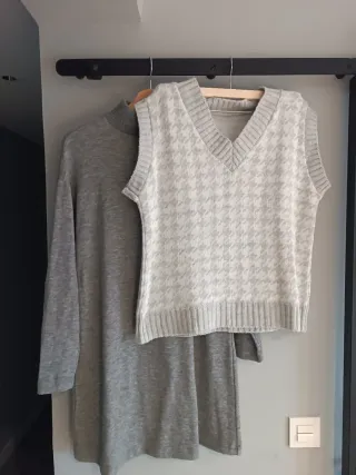 Conjunto de dos vestidos. - Vestido gris de punto y cuello alto de Mango, talla M - Vestido estampado de serpiente de Stradivarius, talla S pero amplia