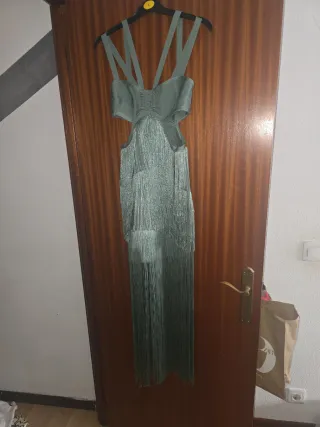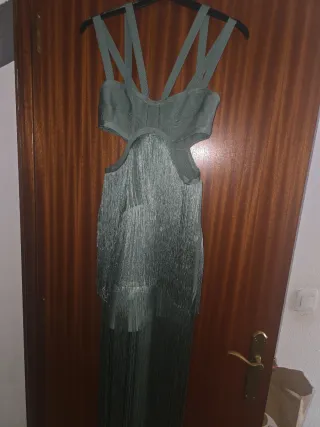 Vestido largo con un diseño llamativo de flecos.tela de vendaje - Tirantes finos. - Corte en la cintura. - Flecos largos en cascada.