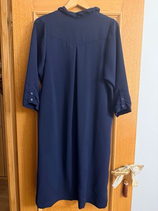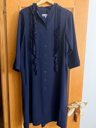 Elegante vestido azul de El Ganso con un diseño moderno y detalles de volantes en la parte superior. - Cuello redondo. - Cierre de botones. - Mangas tres cuartos. - Adorno de volantes en la parte frontal. Talla 44, y va con un cinturón azul (opcional). Tiene bolsillos en el lateral en la parte de la cadera.