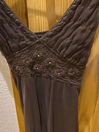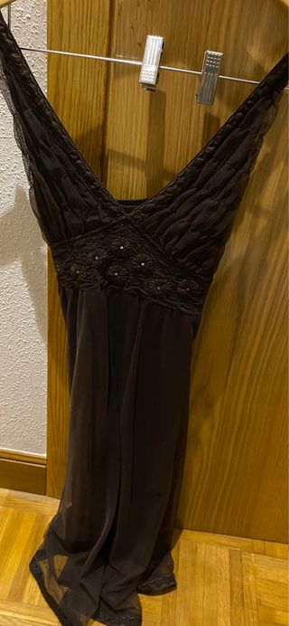 Vestido de ceremonia en color marrón, ideal para eventos especiales. Su diseño es elegante y favorecedor. - Tejido ligero y vaporoso. - Detalle de pedrería y flores en la cintura. - Escote en V. - Bajo con puntilla. - Usado una sola vez