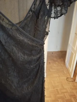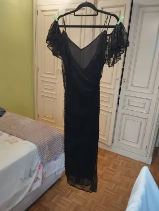 Elegante vestido largo negro de Mango, con detalles de encaje y plumeti con escote cruzado y fruncido.Espalda con frunce central Tiene un falso de tirantes Vestido muy Sensual para lucir en para ocasiones muy especiales - Diseño con tirantes finos rematados con volantes del mismo material dejando hombros al descubierto - - Tejido semitransparente con detalles de encaje. - Corte ajustado al cuerpo.
