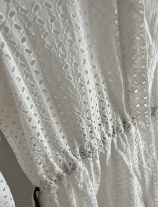 Vestido de verano corto con un diseño de encaje calado. - Mangas cortas. - Cintura elástica con detalle. - Cierre de botones.