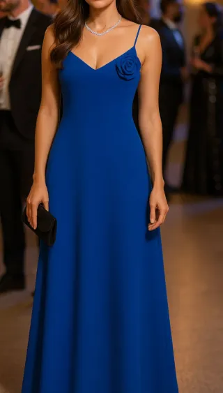 Precioso vestido largo color azul eléctrico. - Tirantes finos. - Confeccionado en tejido ligero. - Adorno floral en el pecho. - Corte fluido y favorecedor. . En la parte de atrás con goma y tirante cruzado. Precioso fácil de combinar tanto para un evento cómo algo informal. Es flojito. Talla única. Una L/XL yo uso 95%poliester 5% elastano Largo 120 Ancho 45 (hasta 52)