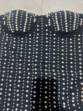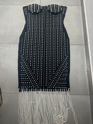 Vestido de fiesta con un diseño elegante y llamativo. - Detalle de perlas incrustadas en todo el vestido. - Adornado con flecos de perlas en el bajo. - Estilo bandage ajustado. es talla L pero yo diria que talla mas grande al ser elastico