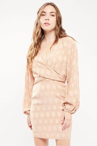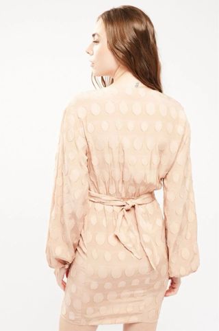 Vestido de tubo de ASOS con un diseño elegante y favorecedor. - Tejido con relieve de círculos. - Manga larga abullonada. - Escote cruzado. - Corte ajustado. - Estampado de lunares. - Tiras anudables detrás. Marca: ASOS Color: rosa pastel Talla: 36 Nuevo con etiqueta. Precio en tienda: 46,90€
