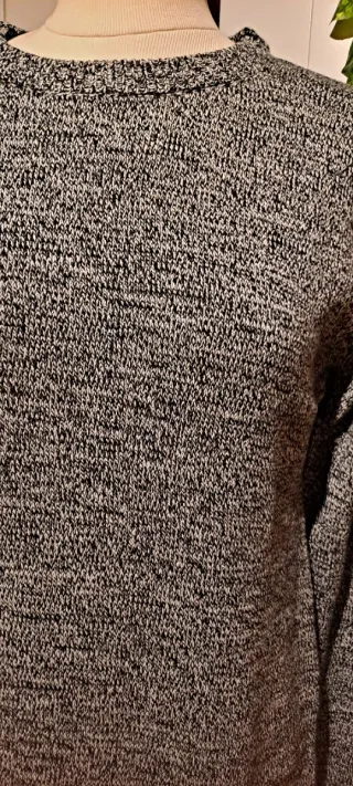 Vestido de punto de manga larga con un diseño jaspeado en negro y blanco roto. Un fondo de armario. Calidad 10 - Cuello redondo. - Corte midi - Tejido de punto con cuerpo y caida