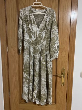 Vestido largo con un bonito estampado de palmeras y detalles en tonos verdes y blancos. Tiene un escote en pico y mangas largas. - Estampado tropical. - Escote en pico. - Mangas largas.