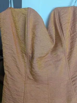 Vestido de fiesta con un diseño elegante y moderno. Color tornasolado naranja/dorado - Tejido con textura y detalles brillantes. - Diseño sin tirantes. - Tul y forro