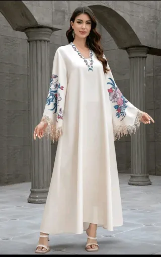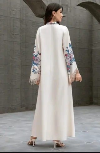 Elegante vestido largo de corte fluido, ideal para ocasiones especiales o para un look sofisticado. - Diseño con estampado floral en mangas. - Puños bordados con lentejuelas y flecos - Escote adornado con estampado