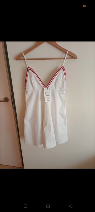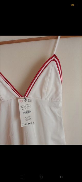 Precioso vestido blanco de Zara, talla XS (34/6). Es un vestido de tirantes finos, con un diseño sencillo y elegante. - Cuello en pico. - Bajo acampanado. - Detalle de ribetes en rojo.