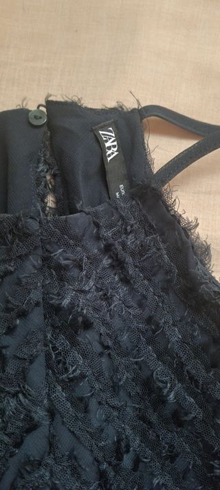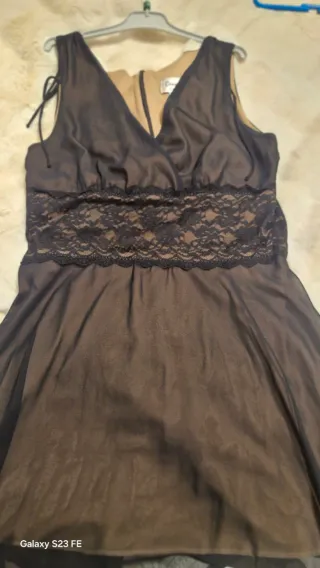 Elegante vestido de cóctel con un diseño sofisticado. - Tejido exterior de tul negro. - Forro interior en tono marrón. - Detalle de encaje en la cintura. - Tirantes finos con lazada.