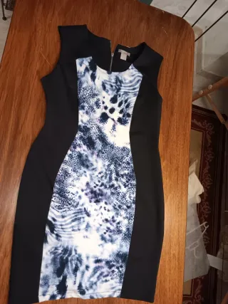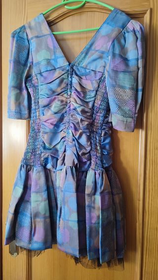 Vestido con un estampado geométrico y abstracto en tonos azules y morados. Presenta un diseño fruncido en la parte delantera y una falda con vuelo. - Mangas cortas abullonadas. - Escote en V. - Detalle de tul en el bajo. - largo 90cm Se le quitó unos adornos y se quedó la marca quw se aprecia en la foto