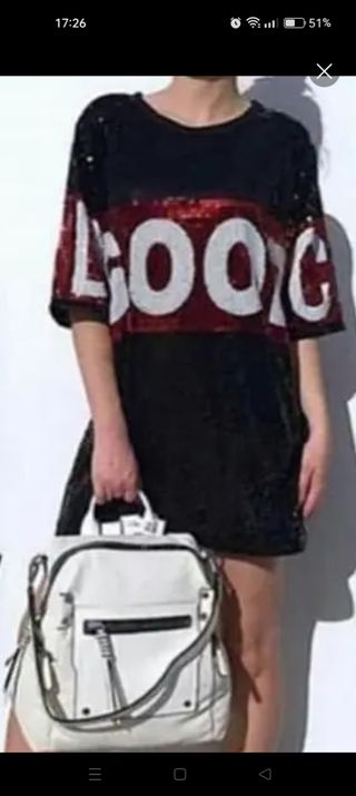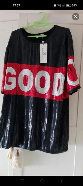 Vestido con lentejuelas brillantes que combinan negro y rojo. Un diseño llamativo y moderno. - Mangas cortas. - Diseño tipo camiseta larga.