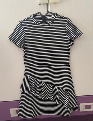 Vestido de rayas con un diseño moderno y favorecedor. - Estampado de rayas horizontales y verticales. - Volante en la parte inferior. - Cremallera en la espalda.