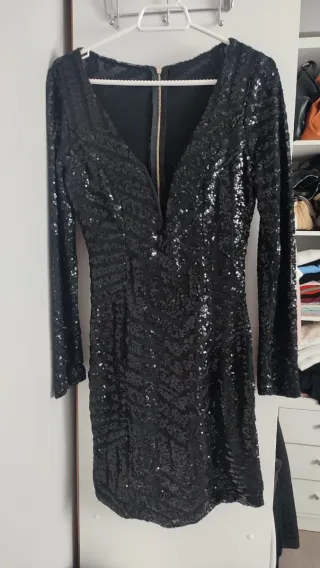 Elegante vestido con lentejuelas brillantes y manga larga. - Diseño con escote pronunciado. - Cierre de cremallera. - Acabado con lentejuelas.
