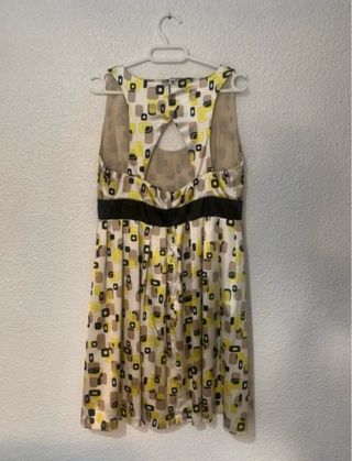 Precioso vestido vintage de corte retro, ideal para ocasiones especiales. Es de color beige y amarillo, con un estampado geométrico. pecho máximo 90. - Cintura marcada con banda negra. - Escote en V con detalle de abertura en la espalda.