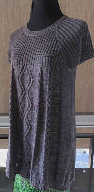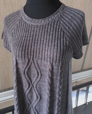 Vestido suéter de punto con un diseño elegante y moderno. Perfecto para un look casual y cómodo. - Tejido de punto acanalado. - Detalle de trenzas en la parte delantera. - Mangas cortas. - Cuello redondo.
