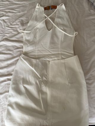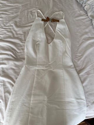 Vestido blanco con un diseño elegante y detalles únicos. - Escote pronunciado en V. - Tirantes finos. - Detalle de hebilla marrón en la parte superior. - Espalda cruzada.