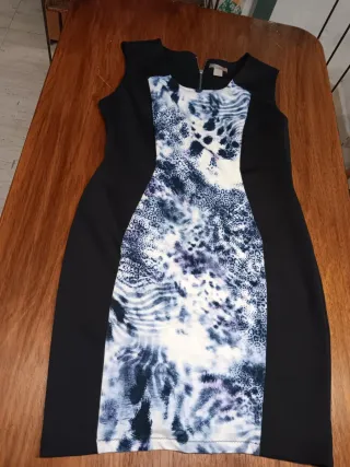 Elegante vestido de invierno con un diseño moderno. - Panel frontal con estampado abstracto en blanco, azul y negro. - Diseño sin mangas. - Cremallera trasera para cierre.